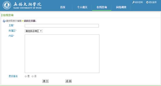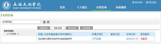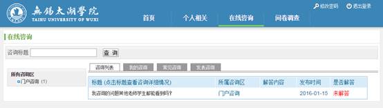 信息门户在线咨询模块为学校师生提供了一个在线沟通的平台,提问者将所要咨询的问题提问到相关的咨询区,该咨询区管理人员即可进行回复。