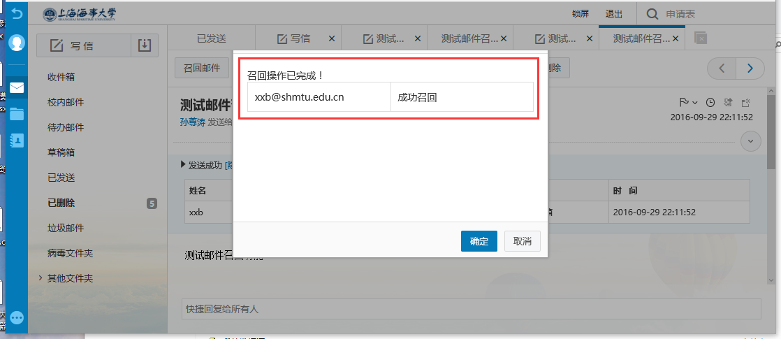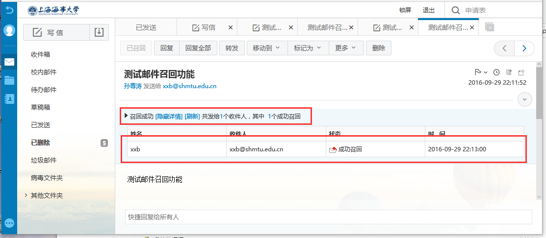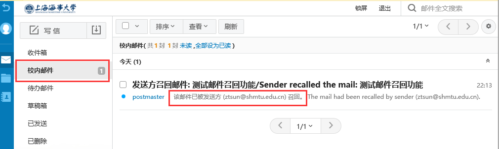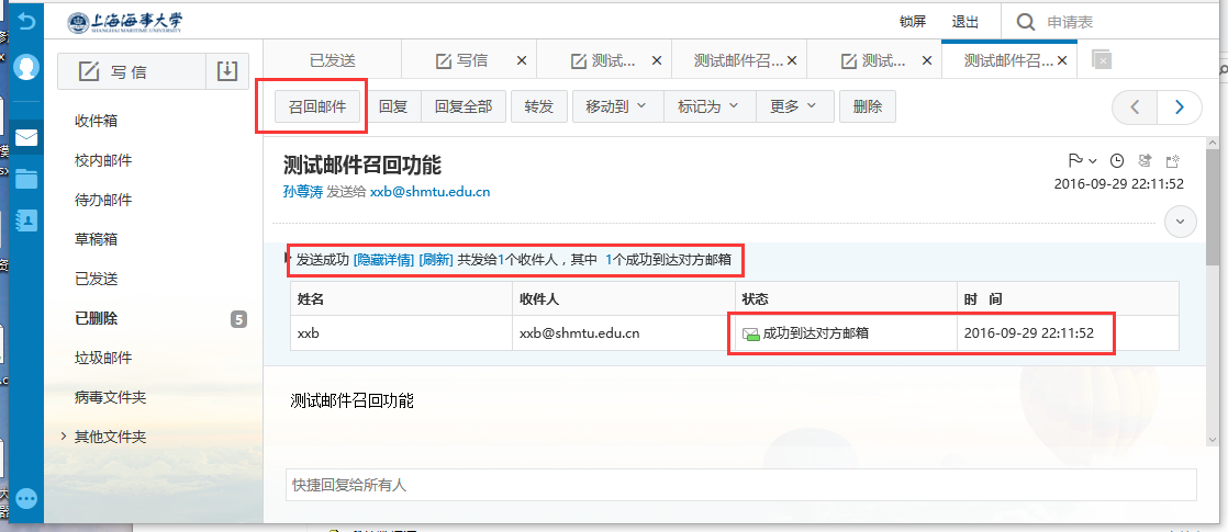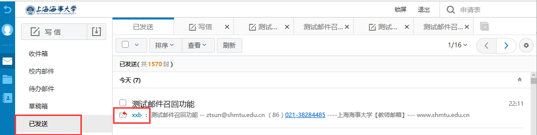 在"已发送"文件夹下,找到已发送的邮件。注意,只有当邮件未被对方阅读时,方可召回邮件,并且对方是可以看到召回记录的。